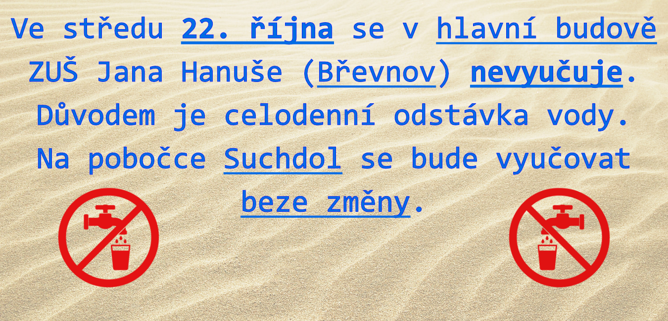 Ve středu 22. října se v hlavní budově ZUŠ Jana Hanuše (Břevnov) nevyučuje. Důvodem je celodenní odstávka vody. Na tento den je v hlavní budově vyhlášeno ředitelské volno. Na pobočce Suchdol se bude vyučovat beze změny.